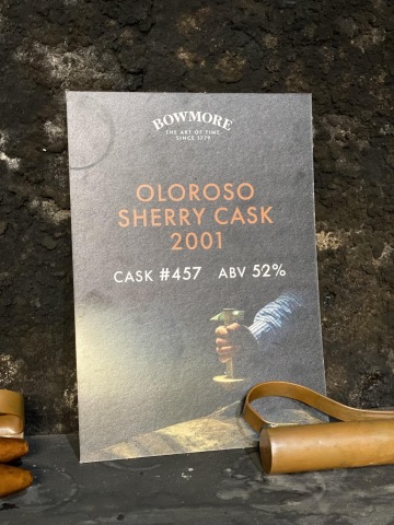 Bowmore 2003, 19letá whisky stařená v hogsheadu po bourbonu Jim Beam, sud 855 v síle 53% - první dámička k tanci. Opět, už poněkolikáté na Islay, jsem byl překvapen, jak může být whisky čistě po bourbonu skvělá! „Mňam, to snad není možný!“ Fakt, sám sobě bych přeci nelhal. Krásně plná whisky s takovou pěknou rovnováhou kouře, vanilky, rozinek, přezrálých jablek, snad až trochu exotického ovoce. Byl jsem opravdu moc překvapený tím, jak dobrý to je. Jenomže. Vzorek číslo dvě a jsme úúúplně jinde! Velký skok. Bowmore 1999, 23letá whisky v barrique po francouzském víně, sud 2304 v síle 47,2% byla prostě jinde. Mnohem více chuti, tohle byl Bowmore, na který jsem se těšil – hodně mohutná, taková usedlá whisky, trocha kouře a pak příval plné chuti koření, dubových tónů, čokolády, kandovaného ovoce… Tohle musela být rozhodně jedna z nejlepších whisky, co jsem kdy pil. A že rozhodně nebyla nejlepší jsem zjistil záhy. Třetí vzorek už mi svou barvou dával tušit, že tohle bude mohutné sherry. Bowmore 2001, 21letá whisky z buttu po sherry Oloroso, sud 457 v síle 52%! „Jo, tak tohle pánové, je znovu o parník vejš!“, vykřikl jsem a dal klukům najevo, že mám dnešního vítěze. Jestli jsem se ve svých vyprávěních už zmiňoval o tom sklepu a zatuchlosti, co je v tom cítit, a to myslím v dobrém, tak tady to bylo v plné polní! To byla prostě stará whisky. Často jsme si na komparativních degustacích říkali, že tohle cítíme ve whisky z 80. let třeba a dneska už takové whisky moc nejsou. Ale tady to bylo.