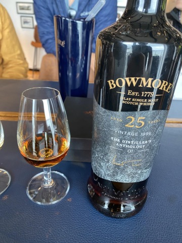Po chvíli přišla Margaret a nesla tři láhve. Bowmore 15, 18 a 25! Ovšem ne klasiky, ale 15letá (first-fill bourbon) a 18letá (first-fill sherry) byly limitky pro Feis Ile, obě v omezeném počtu 3 000 kusů, a nejstarší byla Bowmore 25 The Distiller’s Anthology 01 (first-fill sherry, 3 516 kusů). Položila je doprostřed stolu se slovy: „you can pick one of these…“. No, vyberte si jen jednu, že? Dobře, nebudeme si na nic hrát, snad všichni si vybrali 25, ačkoliv Margaret z toho nevypadala nadšená a vychvalovala nám 18letou. A dělala to dobře, protože jsme si jí nakonec zakoupili navíc, abychom měli porovnání s 25letou. Musím říct, že obě byly vskutku nádherné! Ono v tom prostředí, v tom rozpoložení, ve kterém se člověk nachází, to je pak těžké, aby vám něco nechutnalo. Ta 25 mi hodně připomněla mojí Oloroso sherry ze skladu, jen byla možná více uhlazená, přívětivější, přesto stále hodně mohutná s krásným starým Bowmore charakterem. A víte co? Já jsem se reálně začal zajímat o tu 25ku, že bych si jí koupil. Možná jsem to i měl udělat, ale já chci láhve na pití a 500 liber je zkrátka výrazně nad cenu, za kterou si kupuji láhve. I přesto, že se mi ji jedna část mého já snažila vnutit a měla dobré argumenty, například že za láhev Lagavulinu 25 bych dal 2 000 liber a že toto je vlastně fajn cena, přesto, majitelem jedné z pouhých 3 516 lahví jsem se nestal. Jsem však jeden z těch, co měli tu čest ochutnat. A to je taky fajn, no ne?