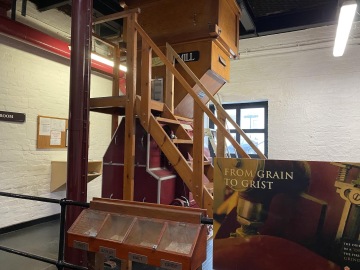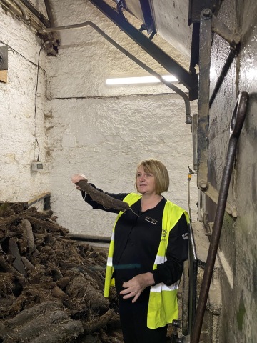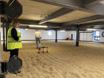 A jelikož v Bowmoru si sladují, nemohla tour začít jinde než na podlaze sladovny. Margaret nám vysvětlila, jak se věci mají a pak nám předvedla práci s obracečkou ječmene. S nadšením jsme i my využili pobídku a fyzicky náročnou práci si vyzkoušeli. Kdo to zkusil tak potvrdí, že to je vážně dost náročné a představa, že tohle budu dělat celý den… Navíc bez drammingu? V zimě prý navíc slad nerozprostírají rovnoměrně po podlaze, ale formují do malých kupiček, aby se slad „mazlil“ a tím zahříval. Asi pět schodů nad sladovnou jsme prošli do kilnu. Perforovaný plát, přes který proniká kouř, ale zrno jím nepropadne, držel i naší skupinku nad pecí a my jsme mohli bez obav poslouchat vyprávění o nakuřování sladu. Ten má hodnotu nakouření asi 20-30PPM a je to směs jejich vlastnoručně připraveného sladu a nakoupeného ze sladovny Simpsons Malt. Pokud jde o rašelinu, je zajímavé, jak ji v Bowmoru získávají. Údajně pouze udělají malé otvory do horní vrstvy (ta se stejně napoužívá) a přes ně jsou schopni těžit nižší vrstvy. Jsou tak maximálně šetrní. Je pravda, že tvar té vytěžené rašeliny byl zvláštní – takové nudličky to byly. Kolem mlýnu Porteus z roku 1866 jsme se pomalu prošli k záparovým kádím, kam jsme mohli nahlédnou na zkrápění sladiny.
