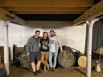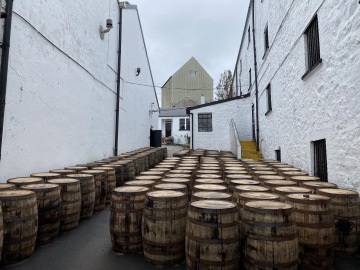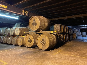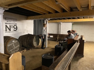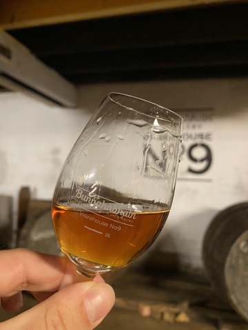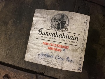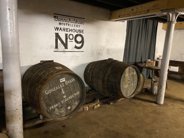Warehouse tasting se odehrával ve warehousu číslo 9, což původně byla sladovna. V palírně už si ale nějakou dobu nesladují a slad nakupují. Zajímavostí také bylo, že budova má tři patra, ale průvodkyně, jejíž jméno si bohužel nepamatuji, nám s úsměvem prozradila, že do horních pater se už ani nedá dostat, a že je tam prázdno. Prázdno ale nebylo ve spodním patře, které bylo plné sudů. Prošli jsme až dozadu, kde byl vymezený prostor pro degustaci. Jak jsme pochopili, na pořadu dne byly sudy. Na rozdíl od ostatních warehouse tastingů, tento byl poměrně skromný, co se počtu návštěvníků týče. Byli jsme snad jen v 7 lidech. Jak asi víte, palírna Bunnahabhain produkuje dva typy whisky – kouřovky a nenakouřené. Logicky jsme začali sudem s nenakouřenou whisky. Jednalo se o destilaci z roku 2006, tedy zhruba 16letý Bunnahabhain, který zrál v sudu po Manzanille (druh Fino sherry) a měl 56,8% alkoholu. Druhý vzorek byl Bunnahabhain 2004, Pedro Ximenez Noe, v síle 52%. Tento 18letý Bunnahabhain zrál v sudu, kde předtím 30 let zrálo sherry, a byl vynikající! Obrovská smršť chutí, citrusy, med, čokoláda, sušené ovoce a trošku dubové tóny… Prostě skvělá whisky! Vlastně jsem přemýšlel, jestli nebyla lepší než nekouřovky z Bruichladdichu.