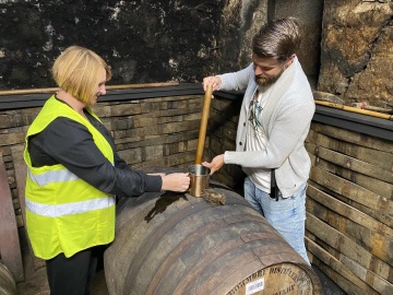 Do skladu jsme tedy vstoupili celkem bez problémů, i když musím uvést na pravou míru jednu věc, kousek za těmi legendárními dveřmi byla ještě mříž, takže nasávat ze sudů by se člověk stejně nedostal. Margaret, která pracuje v palírně Bowmore už 23 let, je zároveň partnerkou Davida Turnera, distillery managera. Dozvěděli jsme se tak i zajímavosti ze zákulisí historie palírny. Třeba si dovolila rýpnout do legendárního Jima McEwana. Údajně prý v čase, kdy působil v palírně jako distillery manager, destiloval příliš rychle, a tak jsou whisky z té doby… no údajně ne tak dobré jako by mohly být. Jedním dechem ale doplnila, že v té době šlo zejména o whisky do blendů, a tak k tomu byl tlačen. No dovolila si dost, kdo to kdy viděl opírat se do modly, nejspíš největšího velikána skotské whisky. Byla to s jistotou první a jediná „špatná“ věc, co jsem kdy o Jimovi slyšel, takže mě to trochu rozhodilo, ale vlastně o moc nešlo a kdo ví, jak to bylo. „Nebudu si tím kazit náladu, však jdeme degustovat whisky ze sudů ve Vaults no.1!“ hodil jsem sám sebe zpět do pohodindy. V rohu skladu na nás za mřížemi s nápisem „Vaults No 1 tasting room“, v takové jako kdyby cele, čekaly na seznámení tři sudy. A všechno pěkně uzrálé whisky.